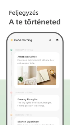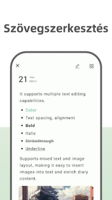 Engedje szabadjára kreativitását a bejegyzései során! Az alkalmazásunk lehetővé teszi, hogy szövegeket és képeket tetszőlegesen kombinálva alakítsa ki naplójának egyedi megjelenését, így minden történet még élénkebbé válik. A professzionális szövegszerkesztő funkciókkal, mint a sortávolság, betűméret, szín és igazítás, teljes kontrollt biztosítunk a vizuális elrendezés felett. Rendezze gondolatait átlátható idővonalakon, vagy használjon tematikus címkéket – legyen az olvasás, tanulás, fitnesz vagy akár titkos bejegyzés –, hogy könnyedén visszakereshesse emlékeit. A beépített sablonok segítségével pedig időt takaríthat meg a gyakran ismétlődő tartalmú bejegyzések elkészítésekor.