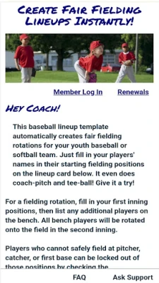 A Baseball Fielding Rotation App automatikusan méltányos mezőnyjátékos rotációkat készít ifjúsági baseball és softball csapatok számára. Támogatja a 7 inninges játékokat, akár 12 mezőnypozícióval és 6 cserehellyel. Lehetővé teszi játékosok kizárását kulcspozíciókból, mint az egyes bázis, elkapó vagy dobó. Segít a csapatfelállítások egyszerűsítésében.
