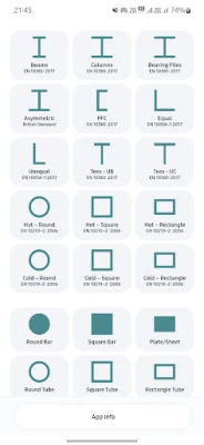 Az alkalmazás rendkívül részletes gyűjteményt tartalmaz a leggyakrabban használt brit szabványú acélprofilokról, magában foglalva az univerzális gerendákat (BS EN 10365: 2017), oszlopokat (BS EN 10365: 2017) és cölöpöket (BS EN 10365: 2017). Emellett megtalálhatók benne az aszimmetrikus gerendák, párhuzamos karimájú csatornák (BS EN 10365: 2017), egyenlő és nem egyenlő szögvasak (BS EN 10056–1: 2017), valamint az UB-ből és UC-ből származó T-profilok (BS EN 10365: 2017). Kiterjed a melegen (BS EN 10210–2: 2006) és hidegen (BS EN 10219–2: 2006) alakított kör, négyzet és téglalap keresztmetszetű üreges profilokra is, garantálva a teljes körű tájékoztatást a felhasználók számára.