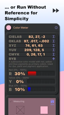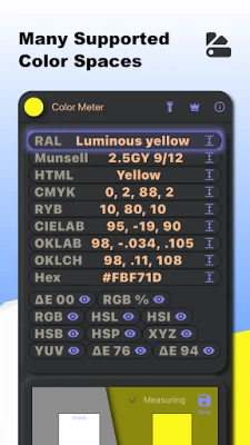 A Color Meter a színterek rendkívül széles skáláját támogatja, a leggyakoribb RGB és Hex formátumtól kezdve a HSL, HSI, HSB, HSP, CIELAB, OKLAB, OKLCH, XYZ, YUV, valamint a szubtraktív CMYK és RYB modellekig, amelyek különösen a festék- és színezőanyag-iparban nélkülözhetetlenek. A Munsell, RAL és HTML szabványos színek, valamint a színelnevezések 40 különböző nyelven is elérhetők, globális használhatóságot biztosítva. Az alkalmazáson belül rugalmasan bővítheti, átrendezheti vagy elrejtheti a színtereket az igényeinek megfelelően. A méréseket kommentárokkal együtt mentheti, majd CSV vagy PNG formátumban exportálhatja, megkönnyítve a dokumentálást és a megosztást. Ideális eszköz művészek, tervezők, építészek, dekorátorok, kutatók, nyomdai szakemberek, fotósok és minden szín iránt érdeklődő számára, a színkalibrációtól a paletta-alkotáson át a mélyreható színanalízisig.