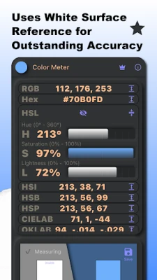 Érjen el kivételesen pontos színméréseket! Az alkalmazás opcionálisan fehér referenciát használ, hogy kompenzálja a változó fényviszonyokat. Ez a módszer jelentősen növeli a mérések pontosságát és megbízhatóságát, segítve a precíz eredmények elérését bármilyen környezetben.