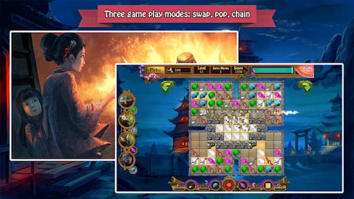 Merülj el a Tales of the Orient: The Rising Sun magával ragadó világában, ahol minden sikeres lapkacsere és rejtvényfejtés közvetlenül hozzájárul egy gyönyörű japán település újjáépítéséhez. A hagyományos match-3 élményt három egyedi játékmód emeli új szintre: a klasszikus lapkacserétől (Csere) kezdve, az azonos elemek csoportjainak megérintésével való eltüntetésen (Pop) át, egészen az összefüggő lapkák elegáns összekötéséig (Lánc). Válassz stílusodnak megfelelően, és gyűjts erőforrásokat, hogy egy elhagyatott területből virágzó közösséget formálj.