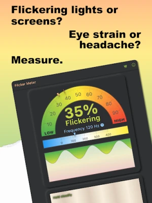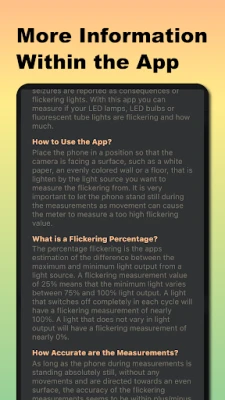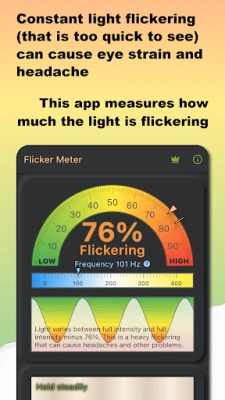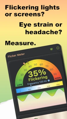 Tapasztalt már szemfáradtságot, fejfájást vagy migrént villogó fények vagy képernyők okozta expozíció miatt? Ez az alkalmazás segít mérni, mely fényforrások villognak, milyen mértékben, és melyek teljesen villogásmentesek. Azonosítsa a problémás forrásokat!