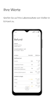 A My Viollier nemcsak a pillanatnyi állapotról ad tájékoztatást, hanem az Ön teljes orvosi laboratóriumi történetét is kéznél tartja. Legyen szó utazásról, orvosi konzultációról vagy kórházi felvételről, minden releváns adat azonnal elérhető. Kövesse nyomon értékeinek alakulását táblázatos és áttekinthető grafikus formában, hogy mindig tisztában legyen egészsége dinamikájával. Lehetősége van a leletek PDF formátumú megtekintésére és mentésére is, méghozzá négy különböző nyelven – németül, angolul, franciául és olaszul –, biztosítva ezzel a rugalmasságot és az érthetőséget külföldön is.